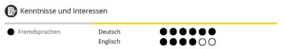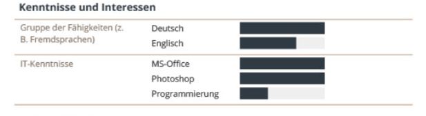 Du kannst das Niveau deiner Skills auch mithilfe von Balken oder Symbolen im Lebenslauf angeben. Diese Art der Darstellung wirkt sehr modern und eignet sich besonders für kreative oder technische Berufe.
